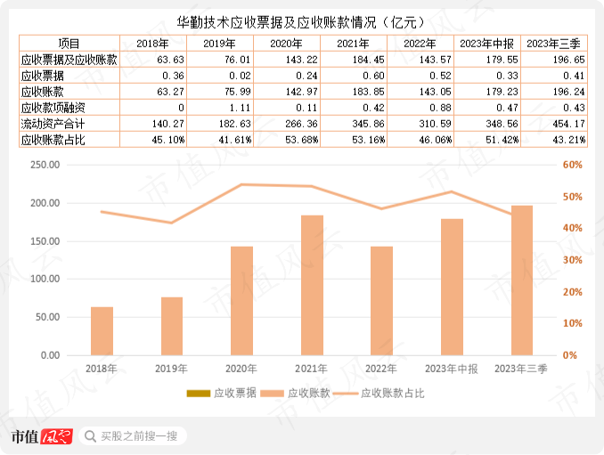 2018年以来,该公司的应收账款占流动资产的比重一直在40%以上,2020年、2021年以及2023年中报均超过50%,占比很大;此外,该公司应收账款呈现较快增长势头,2023年初应收账款余额143亿元,2023年三季度末则增至196亿元,增加53亿元。