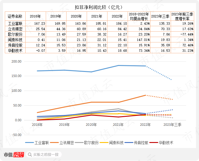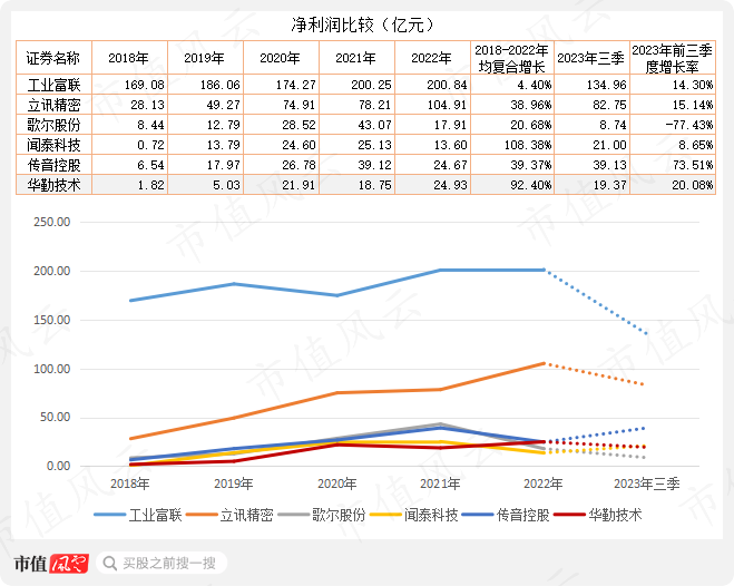 今年前三季度净利润同比增长的是传音控股、华勤技术、立讯精密、工业富联,增速均超过两位数;歌尔股份继续大幅下滑。