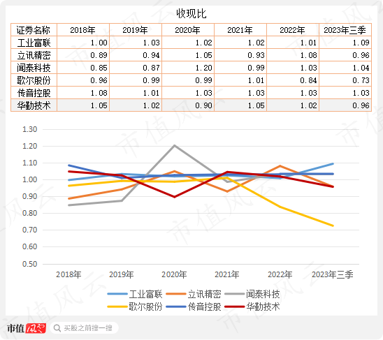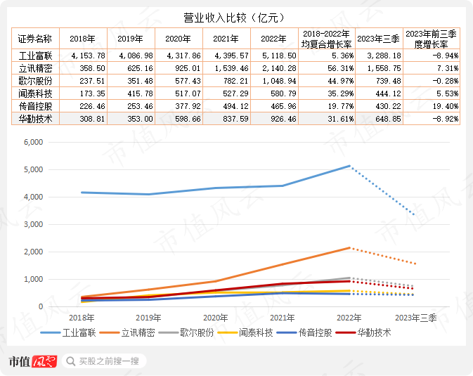 在2023年前三季度中,营业收入保持正增长率的是传音控股、立讯精密、闻泰科技,工业富联与华勤技术同比下滑近9%;歌尔股份微降0.3%。