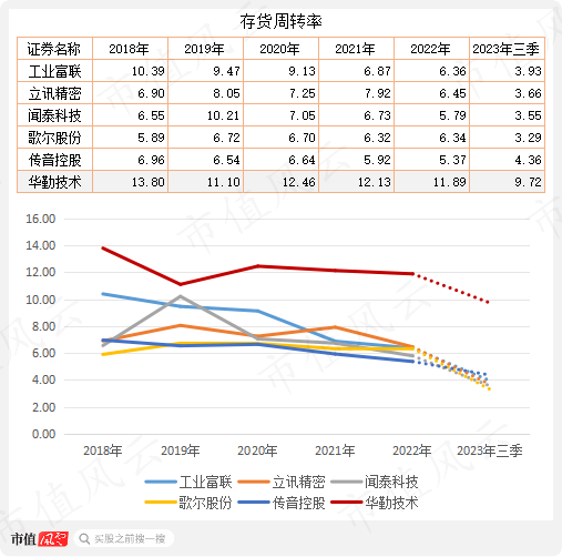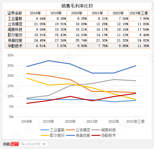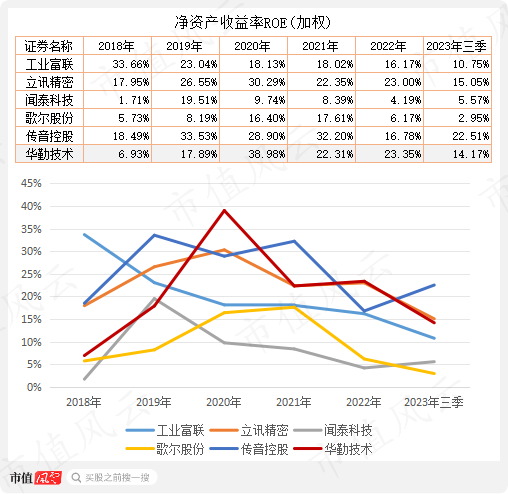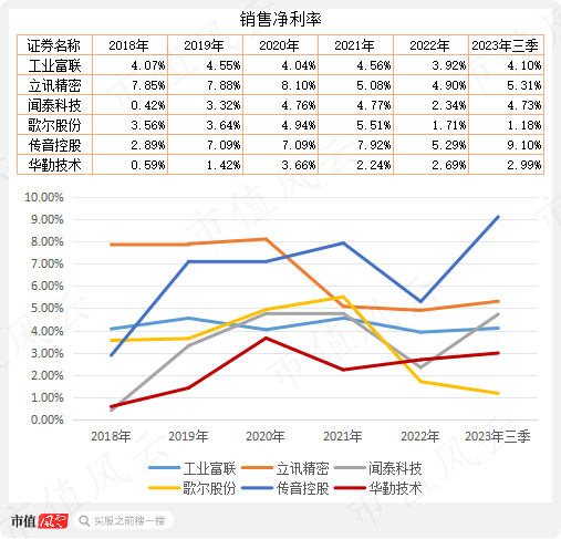 华勤技术的销售净利率也是六家公司在较低的,2020年以来在3%左右;工业富联、闻泰科技在4%左右,立讯精密则是从2018年7.8%降至2023年三季度的5.3%。