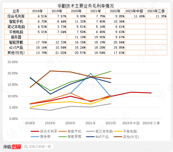 华勤技术的毛利率则是呈现上升趋势,从2018年的6.5%上升至2023年三季度11.4%,但与同行业代工企业相比,其综合毛利率已接近核心客户锁定的毛利率上限。