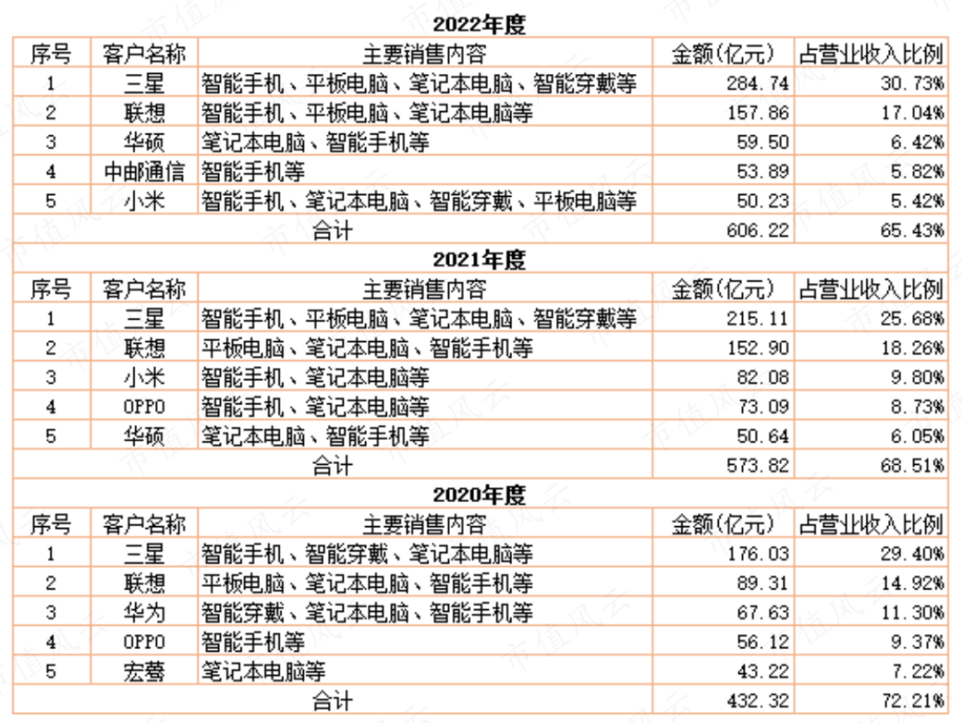 该公司对前五大客户的销售占比很高,2020年至2022年均在65%以上,其第一、二大客户分别是三星、联想,对两家公司的依存度非常高,销售收入占比均超过营收的40%。