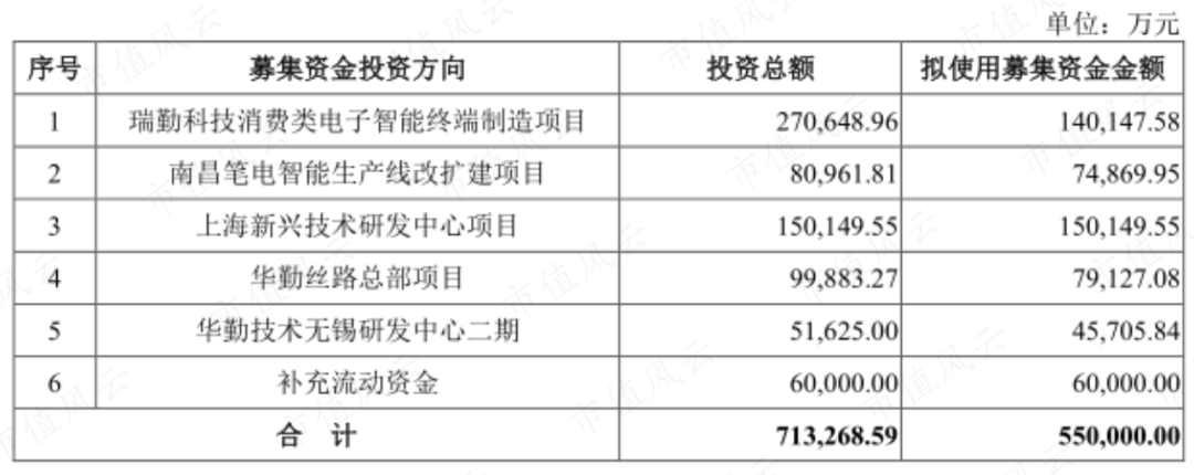华勤技术以80.8元/股价格发行7242.52万股,募资58.52亿元,扣除发行费用1.21亿元,净募资57.31亿元,投向瑞勤科技消费类电子智能终端制造、南昌笔电智能生产线改扩建等6个项目。