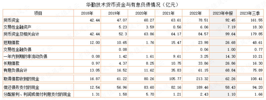 2023年中报,华勤技术货币资金92.45亿元,加上交易性金融资产7.2亿元,合计99.6亿元,较年初的84.57亿元增加了近8亿元;当期末,货币资金中受限资金22.52亿元,可自由支配的货币资金70亿元。