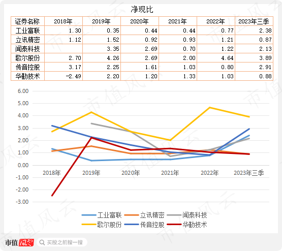 2019年至2022年,除了工业富联以外的五家公司的净现比相对较好,基本高于1.0,这五家公司经营性现金流净额与净利润匹配,甚至高于净利润。