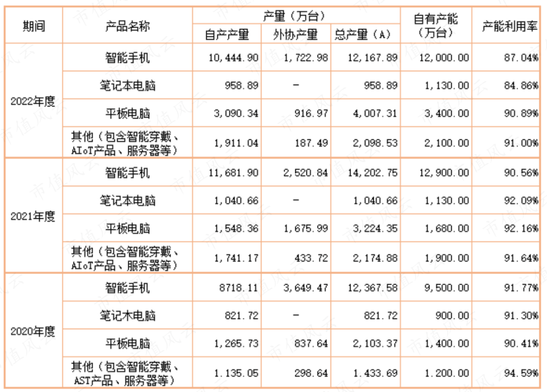 华勤技术的产能利用率在2022年有所下降,智能手机自有产能1.2亿台/年,产能利用率为87%;笔电产能1130万台/年,产能利用率84.9%;平板电脑产能3400万台/年,产能利用率90.9%。
