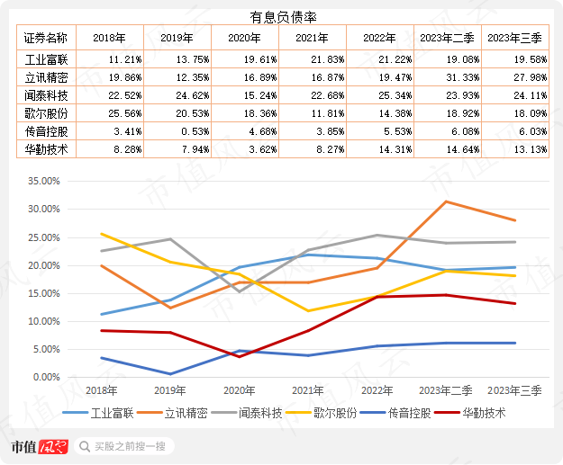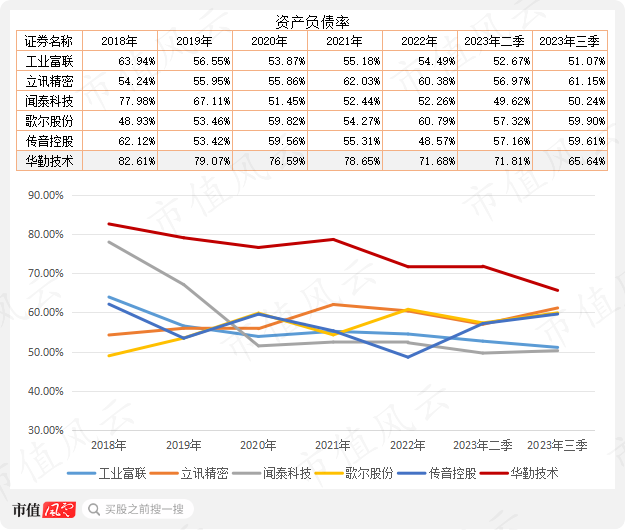 华勤技术是六家公司中资产负债率最高的,2018年为82.6%,2022年为71.7%,2023年三季度末65.6%较年初下降6个百分点。