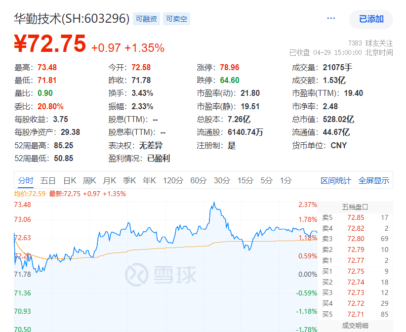 截至发稿,华勤技术收涨1.35%,报72.75元,总市值为528.02亿元。