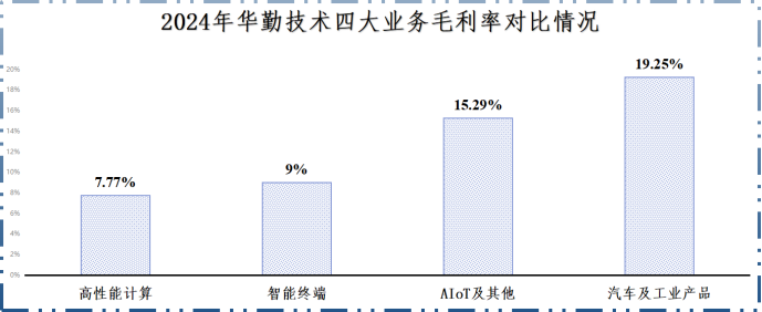 然而,公司高性能计算的毛利率要显著低于其他三类业务。以2024年为例,高性能计算毛利率为7.77%,远小于智能终端(9%)、AIoT及其他(15.29%)和汽车及工业产品(19.25%)。