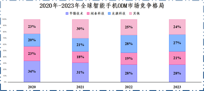 尤其在手机ODM代工领域,公司市占率常年霸榜全球第一,2020-2023年均维持在30%左右,超过另两大巨头闻泰科技和龙旗科技。