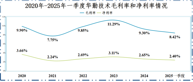 2023年-2025年一季度,华勤技术毛利率从11.29%下滑到8.42%,净利率从3.11%下滑到2.4%,盈利能力基本来到行业末流。