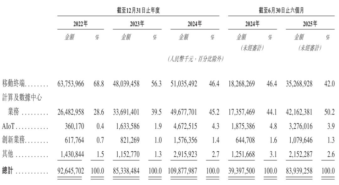 华勤技术2025年上半年移动终端收入为352.69亿元,占营收比例为42%;来自计算及数据中心业务收入为421.62亿元,占营收比例为50.2%;
