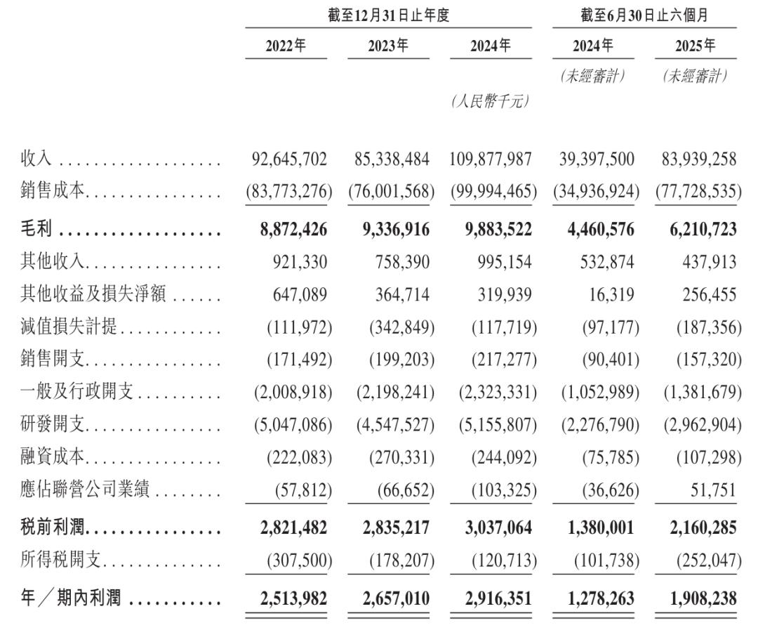 招股书显示,华勤技术2022年、2023年、2024年营收分别为926.48亿元、853.38亿元、1099亿元;毛利分别为88.72亿元、93.37亿元、98.84亿元;期内利润分别为25.14亿元、26.57亿元、29.16亿元。