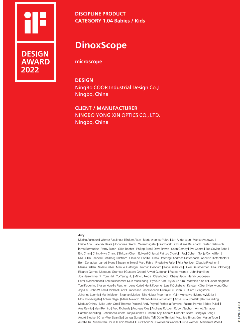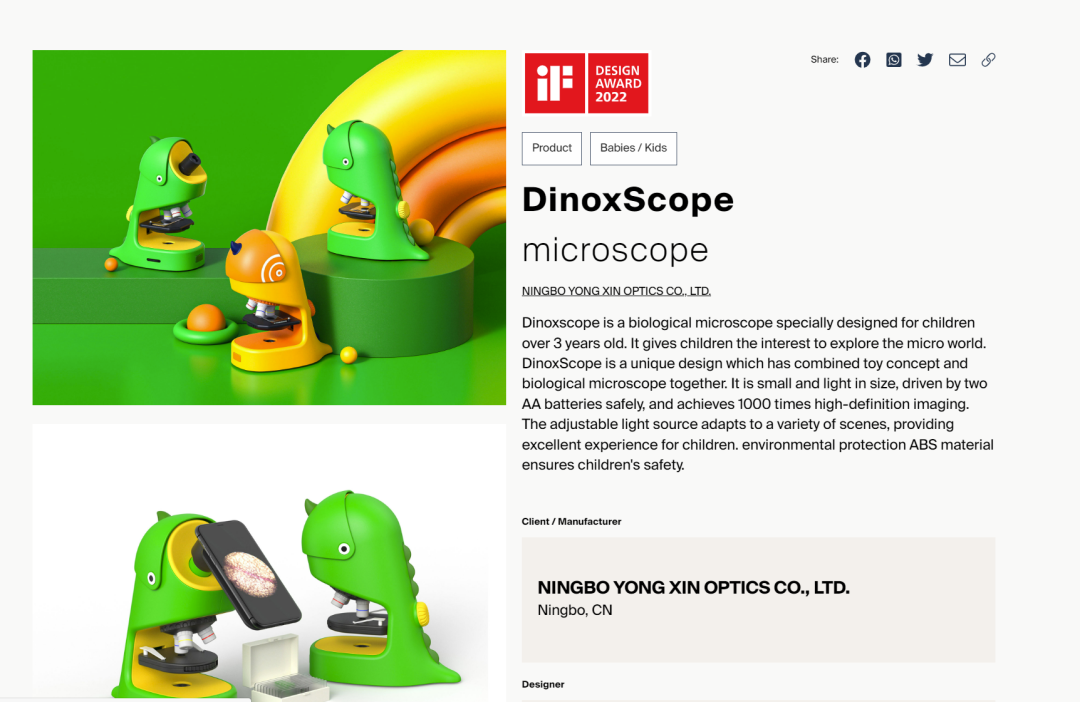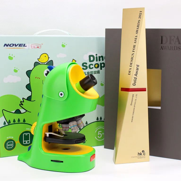 2022年4月,永新光学联合宁波COOR可点设计设计开发儿童启蒙显微镜-小恐龙,荣获全球设计大奖。