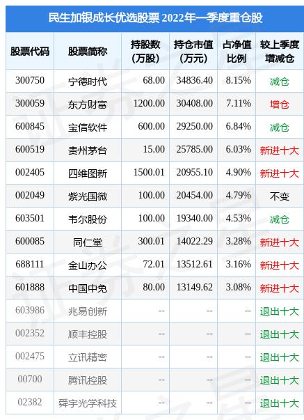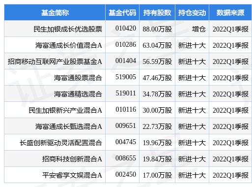 根据 2022Q1 季报公募基金重仓股数据,重仓该股的公募基金共 29 家,其中持有数量最多的公募基金为民生加银成长优选股票。民生加银成长优选股票目前规模为 42.74 亿元,最新净值 0.8317(7 月 7 日),较上一交易日上涨 1.06%,近一年下跌 18.44%。该公募基金现任基金经理为孙伟。孙伟在任的基金产品包括:民生加银策略精选混合 A,管理时间为 2014 年 7 月 7 日至今,期间收益率为 444.92%;民生加银新兴成长混合,管理时间为 2018 年 9 月 7 日至今,期间收益率为 107.79%;民生加银科创 3 年封闭混合,管理时间为 2020 年 5 月 15 日至今,期间收益率为-0.56%;民生加银新动能一年定开混合 A,管理时间为 2020 年 7 月 15 日至今,期间收益率为-15.39%。
