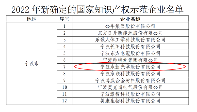 近日,国家知识产权局公布了2022年国家知识产权示范企业和优势企业名单(国知发运函【2022】160号),宁波永新光学股份有限公司成功晋升为“国家知识产权示范企业”。