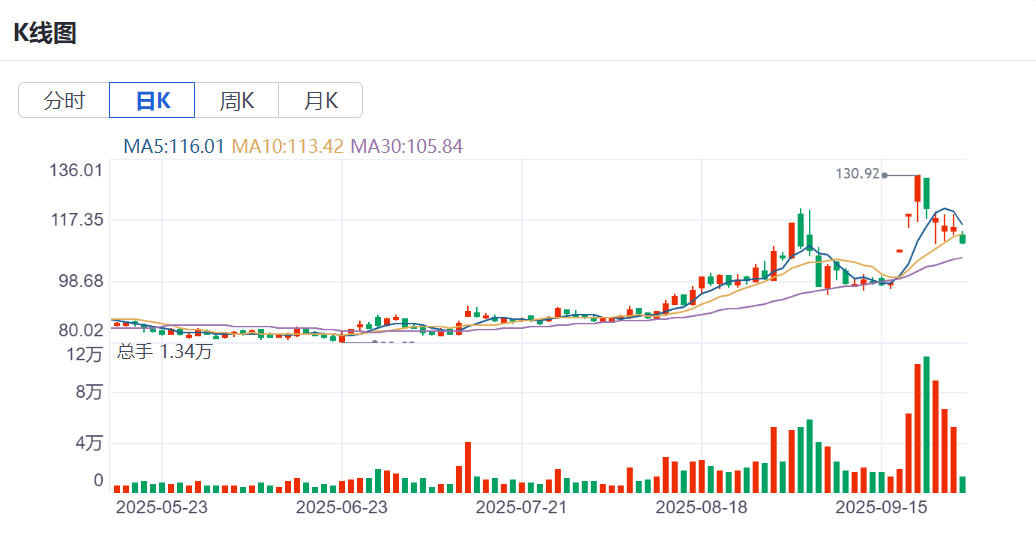 进入三季度,公司股价涨势喜人。9月19日,在斩获三连板之后以130.92元/股收盘,创下股价历史第二高值,距离4月初66元/股的年底低点,涨幅接近100%。