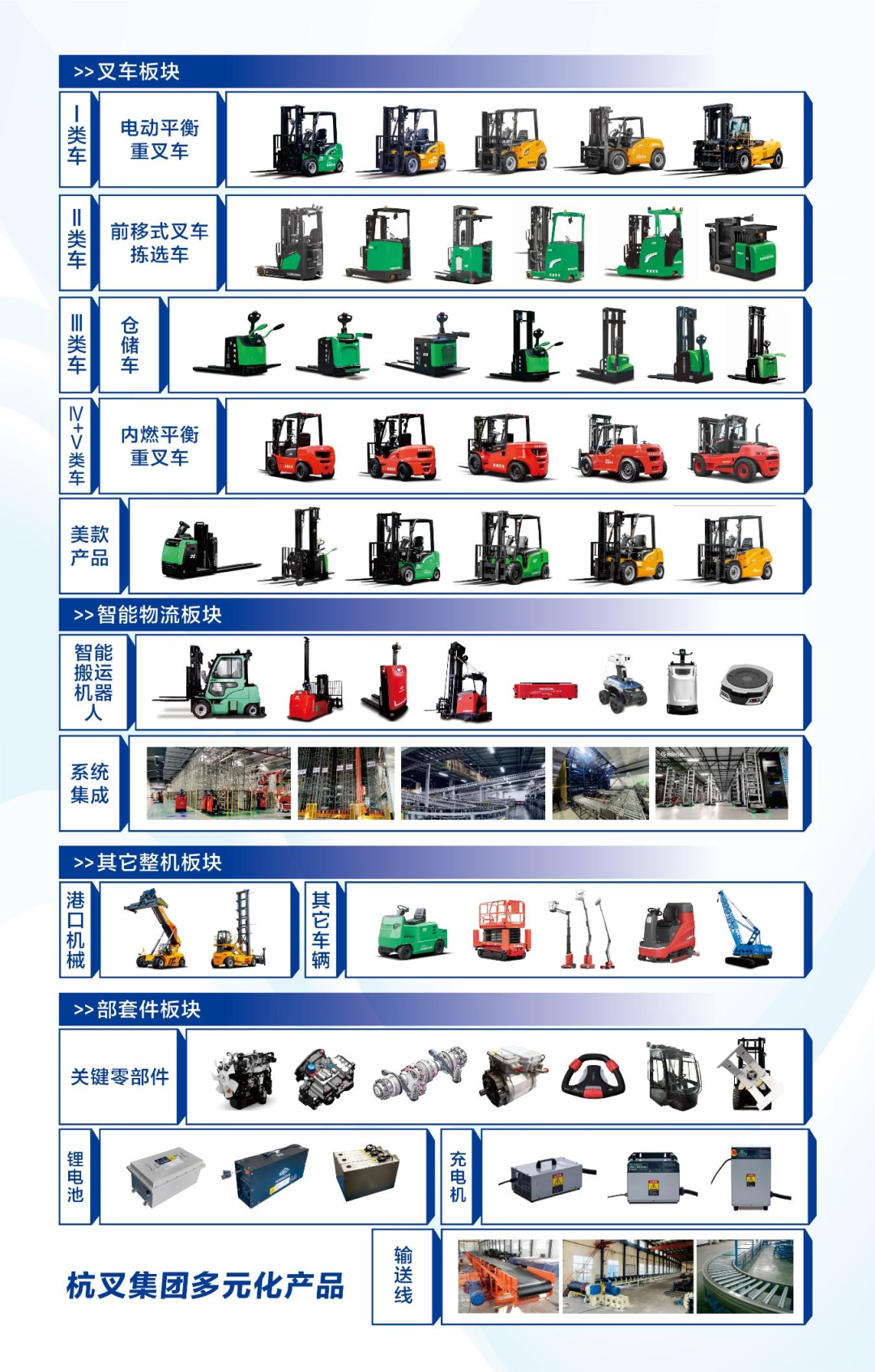 公开信息显示,杭叉集团业务涵盖工业车辆、仓储车、牵引车、自动导运小车(AGV)、高空作业车辆、强夯机、清洁设备等整机及其关键零部件,以及智能物流系统整体解决方案,并前瞻布局人形智能物流机器人等未来产品。