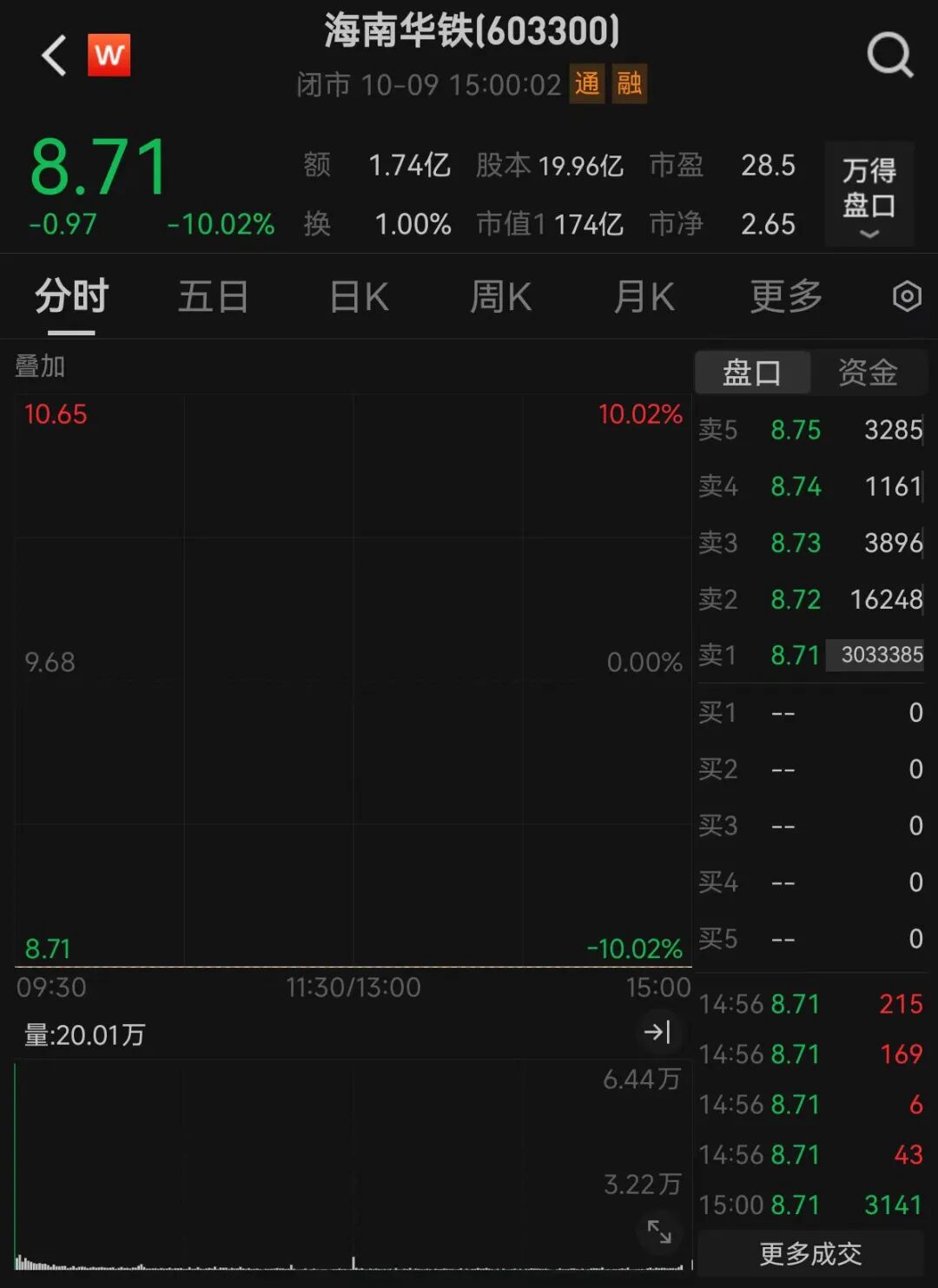 战战兢兢熬过了长假,10月9日开盘,海南华铁股价“一字”跌停,截至收盘,卖一位置仍有26.42亿元卖单正在排队。