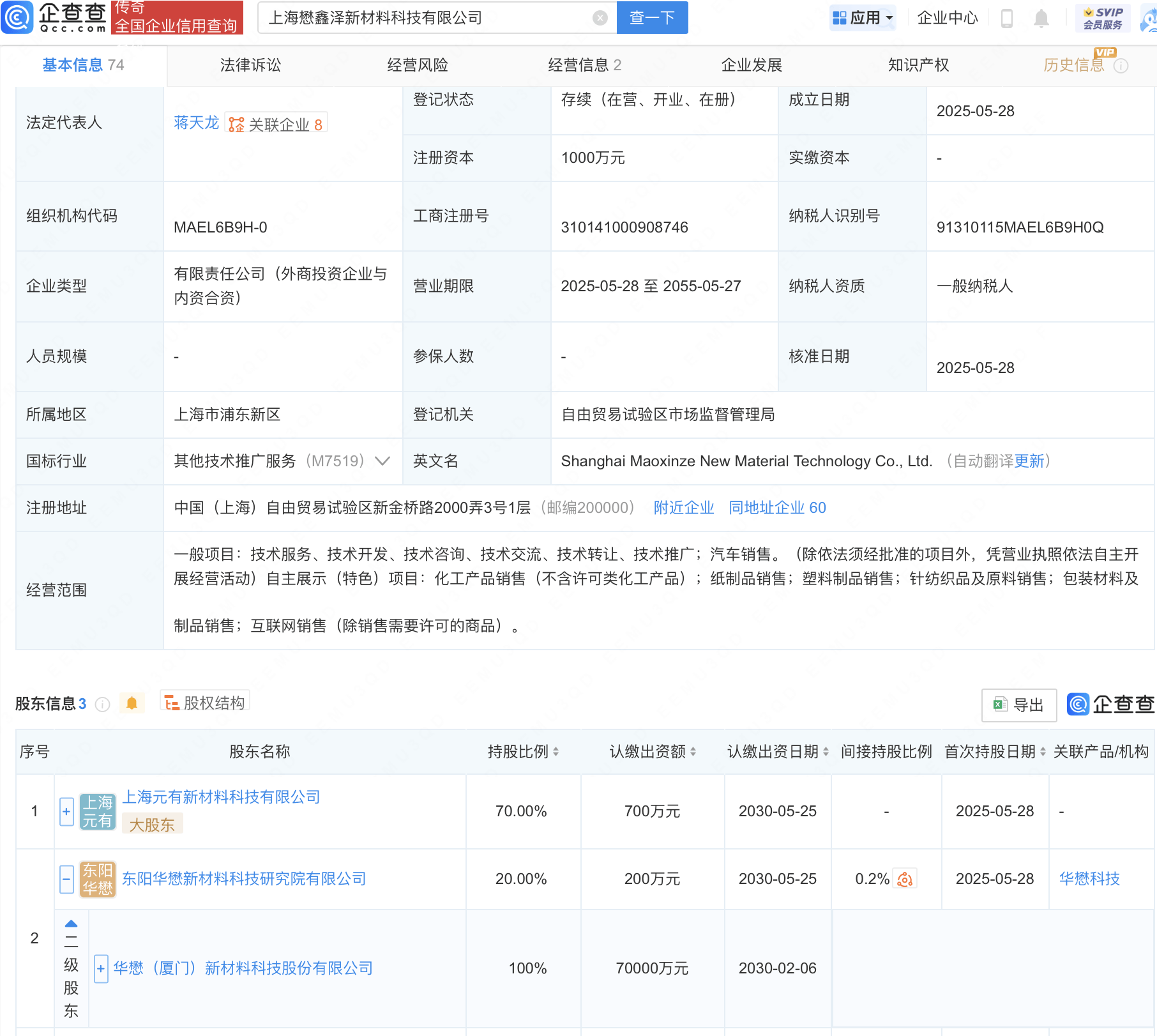 近日,上海懋鑫泽新材料科技有限公司成立,法定代表人为蒋天龙,经营范围包含:技术服务、技术开发、技术咨询、技术交流、技术转让、技术推广;汽车销售等。股权穿透显示,该公司由华懋科技(603306)全资子公司东阳华懋新材料科技研究院有限公司等共同持股。