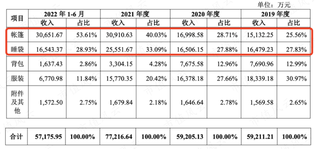 而背包、服装产品营收增速不及帐篷和睡袋,四大产品合计营收占总营收的97%。