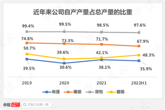 服装产品有一半的产量靠外包,而睡袋产品30%的产量也需要依赖外包,只有占比极低的背包产品公司可以做到完全自产自销。