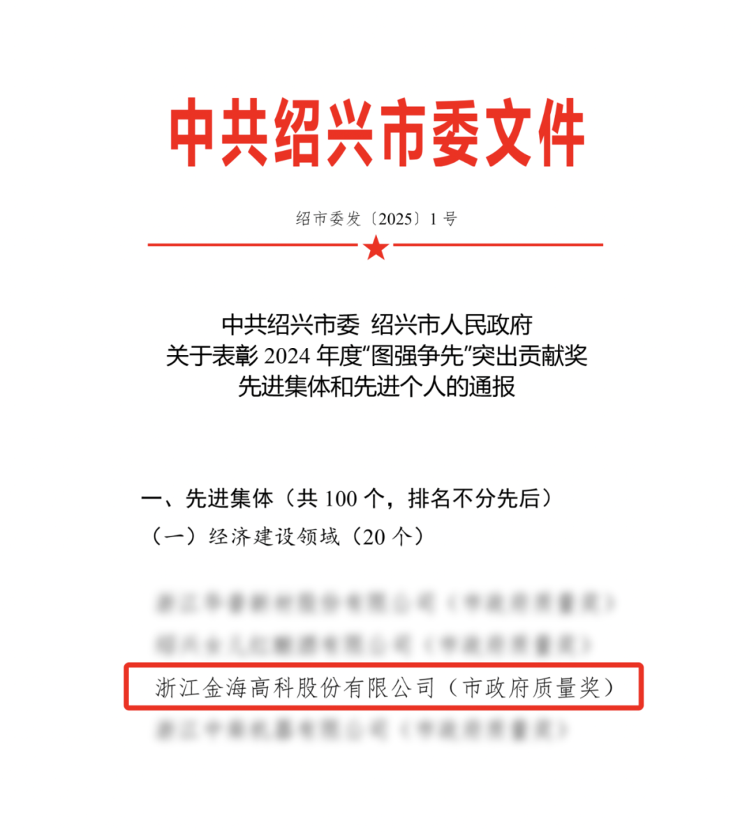 近日,2024年度绍兴市政府质量奖评选结果正式揭晓,金海高科凭借在企业战略、市场营销、卓越绩效、生产研发、社会责任及安全环保等方面的优异表现,从众多优秀企业中脱颖而出,荣获“2024年度绍兴市政府质量奖”。