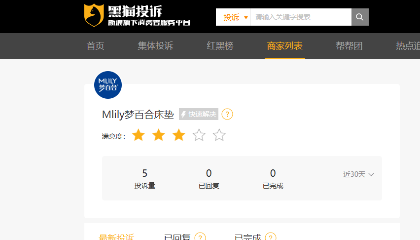 10月30日,据黑猫投诉平台,“Mlily梦百合床”新增5条投诉,投诉问题涉及产品质量、售后服务。