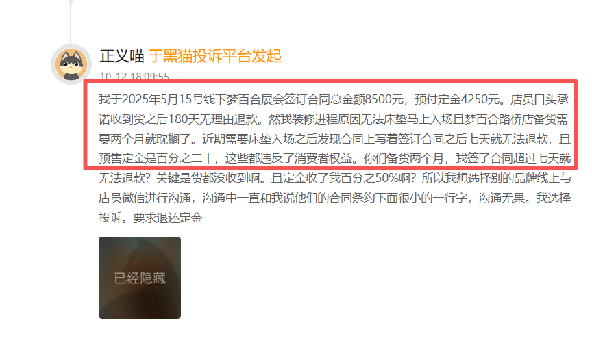 另一起投诉中,消费者于2025年5月15日在梦百合展会现场签订合同,总金额8500元,预付定金4250元。消费者表示,店员曾口头承诺“收货后180天无理由退款”。近期发现,合同条款规定“签订合同七天后无法退款,且预售定金是20%”,在与店员沟通后,双方未能达成一致,消费者现已发起投诉,要求退还定金。