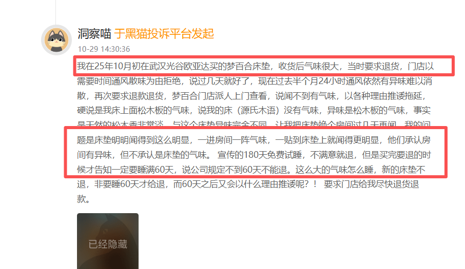 一位消费者投诉称,其于2025年10月初在武汉光谷欧亚达购买的梦百合床垫,收货后存在异味。消费者称,尽管已进行24小时通风半个月,异味仍难以消散。在提出退货要求后,门店工作人员上门检查时否认异味源于床垫,并建议将床垫移至其他房间观察。