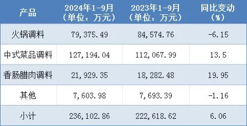 2024年前三季度,天味食品实现营收23.64亿元,同比上涨5.84%。分产品看,曾经的业绩支柱火锅调料收入7.94亿元,同比下降6.15%;增长主要靠中式菜品调料拉动,同比上涨13.5%至12.72亿元,贡献一半以上营收。
