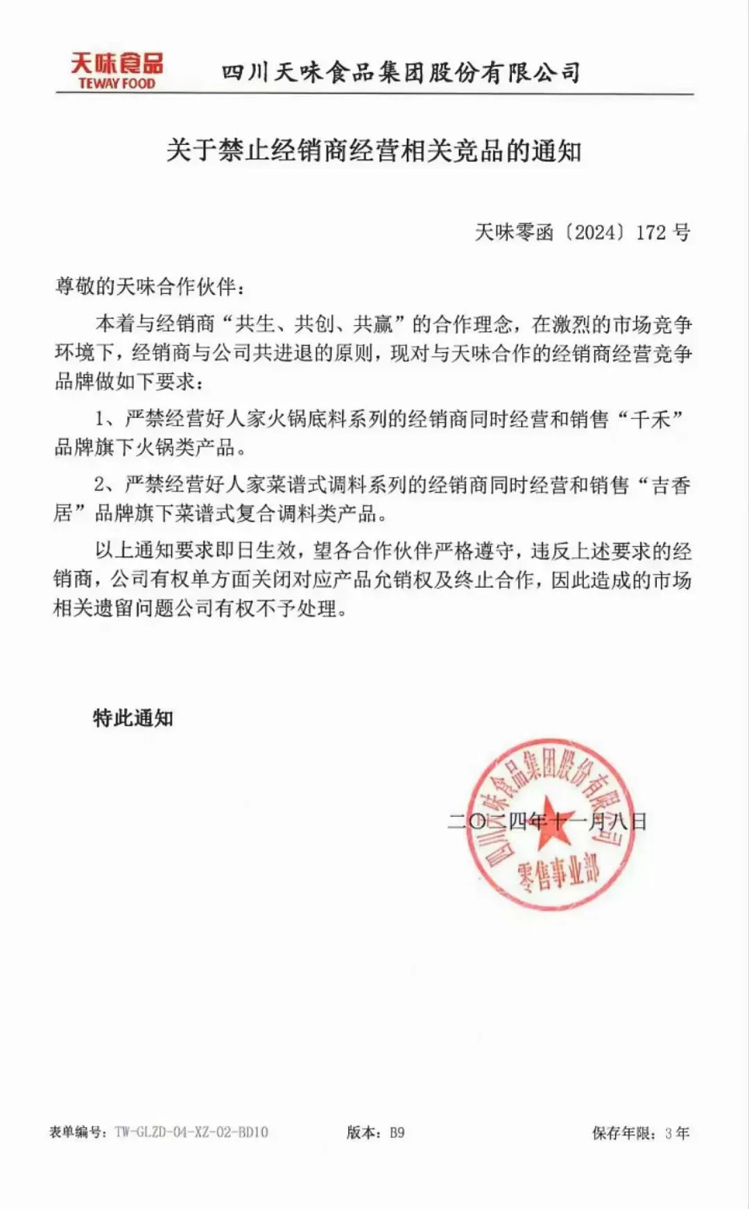 通知要求,经营好人家火锅底料系列的经销商不得经营“千禾”品牌旗下火锅类产品;经营好人家菜谱式调料系列的经销商不得经营“吉香居”品牌旗下菜谱式复合调料类产品。违反上述要求的经销商,天味食品有权单方面关闭对应产品允销权及终止合作。