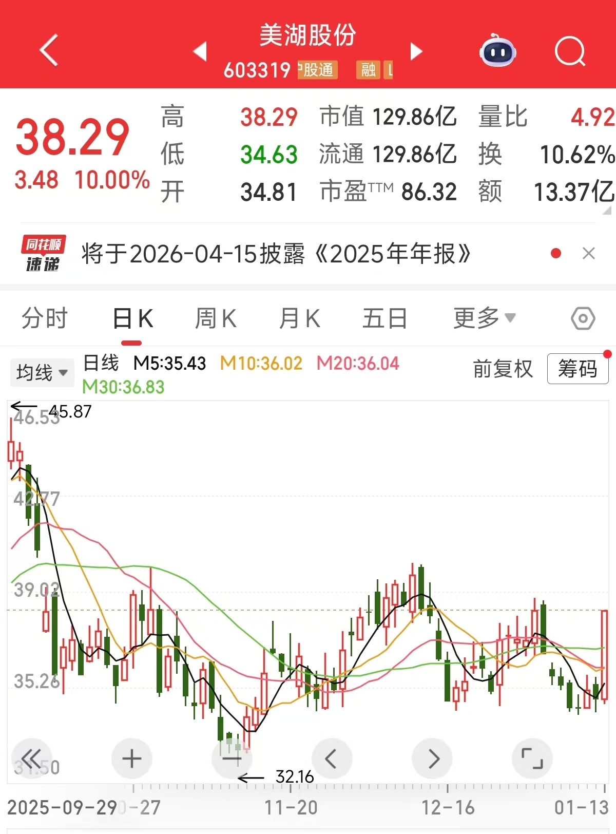 截至1月13日午间收盘,美湖股份涨停,报38.29元/股。