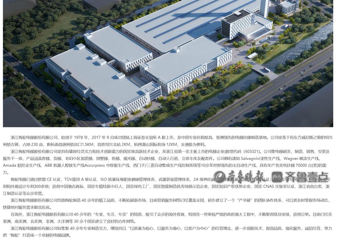 浙江梅轮电梯股份有限公司,始创于 1978 年,2017 年 9 月成功登陆上海证券交易所 A 股上市,是中国专业化程度高、亚洲领先的电梯扶梯制造基地。公司坐落于绍兴柯桥古镇,占地 230 亩。