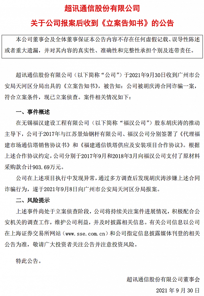 超讯通信10月7日发布公告称,公司于2021年9月30日收到广州市公安局天河区分局出具的《立案告知书》,被告知:公司被胡庆涛合同诈骗一案,符合立案条件,现已立案侦查。