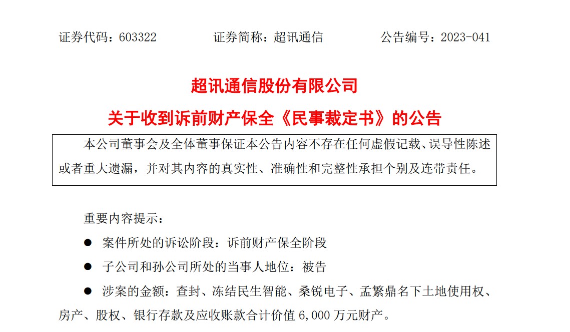 据超讯通信公告,公司于5月9日收到调兵山市人民法院送达的《诉前财产保全申请书》和《民事裁定书》,因借款合同纠纷,铁岭银行股份有限公司调兵山支行(以下简称“铁岭银行”)向法院申请查封、冻结了桑锐电子及其全资子公司辽宁民生智能仪表有限公司(以下简称“民生智能”)、孟繁鼎名下土地使用权、房产、股权、银行存款及应收账款合计价值6000万元财产。孟繁鼎为桑锐电子董事长、法定代表人,同时也是桑锐电子第二大股东。