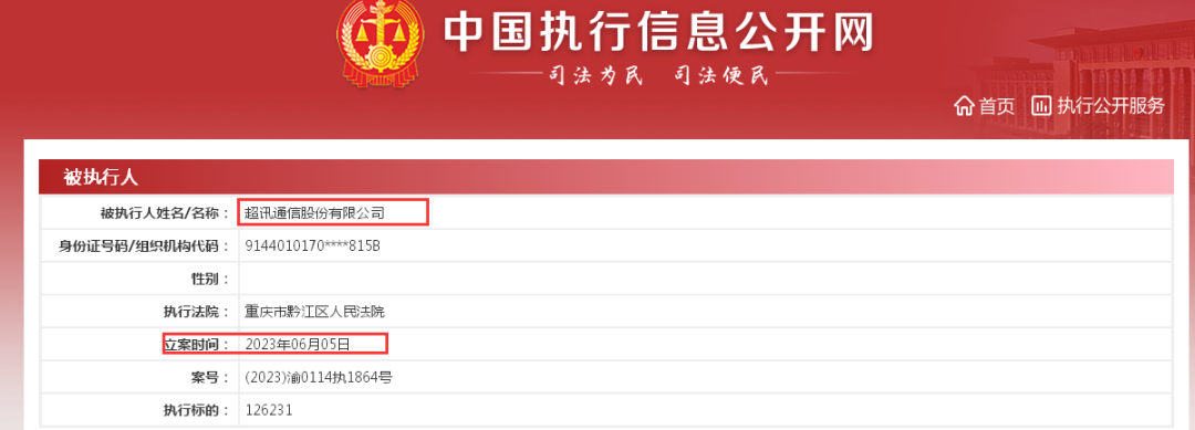 据中国执行信息公开网,2023年6月5日,超讯通信股份有限公司被重庆市黔江区人民法院立案,被列为被执行人,执行标的126231元(约12.62万元)。