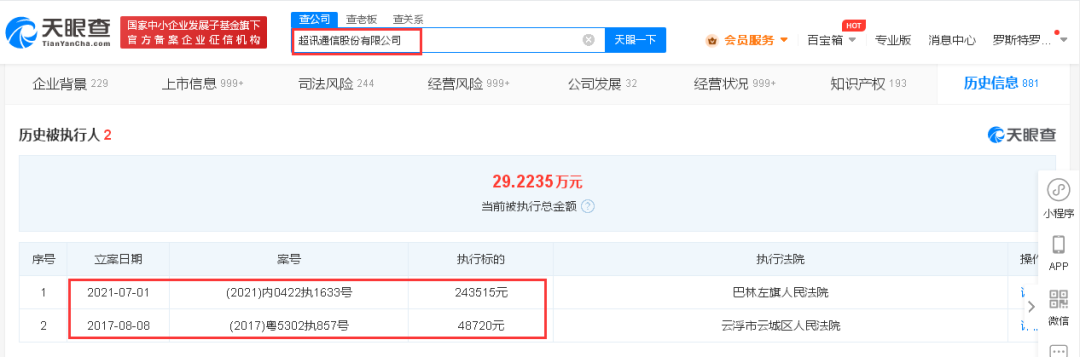 超讯通信亦曾于2017年、2021年被列为被执行人。
