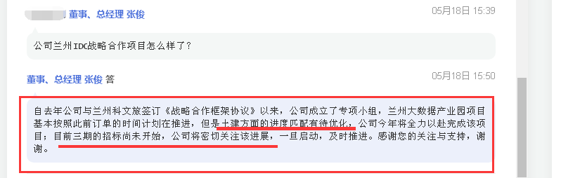 董事、总经理张俊在2022年度业绩说明会上表示,自去年公司与兰州科文旅签订《战略合作框架协议》以来,公司成立了专项小组,兰州大数据产业园项目基本按照此前订单的时间计划在推进,但是土建方面的进度匹配有待优化,公司今年将全力以赴完成该项目;目前三期的招标尚未开始,公司将密切关注该进展,一旦启动,及时推进。