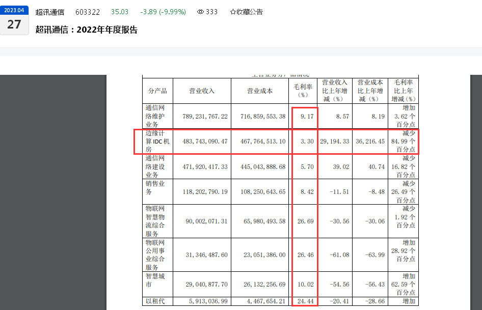 不过,从今年一季度的业绩来看,显然,IDC 综合服务商转型的战略目标仍有待努力。至少从毛利率的情况来看,2022年度,超讯通信的边缘计算IDC机房毛利率仅有3.30%,远低于通信技术服务业,更远远低于物联网业务。