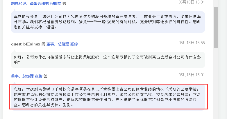 董事、总经理张俊在2022年度业绩说明会上表示,本次剥离桑锐电子股权交易事项是在其已严重拖累上市公司的经营业绩的情况下采取的必要举措,能有效避免标的公司持续亏损给上市公司带来的不利影响,减轻公司经营包袱,控制未来经营风险。