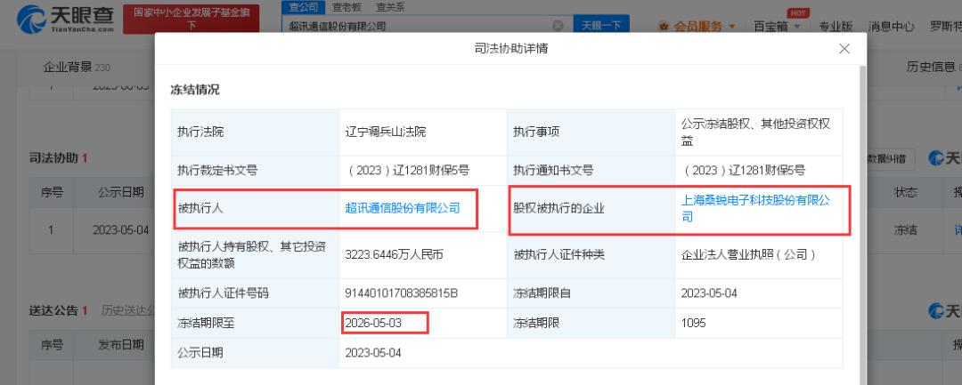 与此同时,今年5月4日,超讯通信作为被执行人,辽宁调兵山法院已冻结其所持有的上海桑锐电子科技股份有限公司股权,股权数额为3223.6446万人民币。