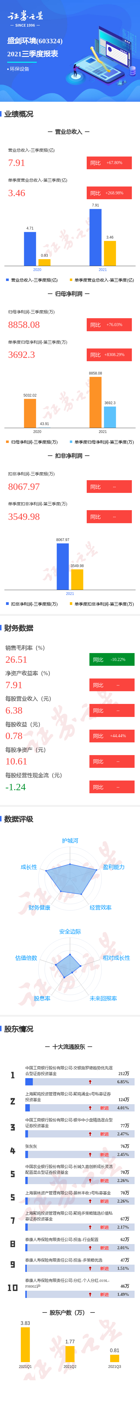 盛剑环境2021三季报显示,公司主营收入7.91亿元,同比上升67.8%;归母净利润8858.09万元,同比上升76.03%;扣非净利润8067.97万元,其中2021年第三季度,公司单季度主营收入3.46亿元,同比上升268.98%;单季度归母净利润3692.3万元,同比上升8308.29%;单季度扣非净利润3549.98万元,负债率35.24%,投资收益277.52万元,财务费用-217.12万元,毛利率26.51%。