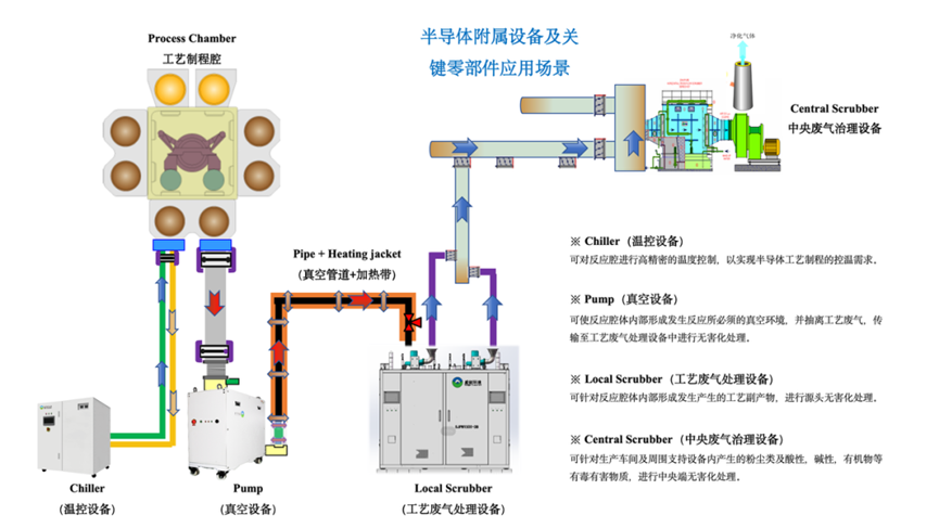 据介绍,项目规划生产产品包括工艺废气处理设备、真空设备、温控设备等。这些产品共同作用于对半导体制程设备反应腔的辅助控制,可使反应腔满足刻蚀、离子注入、扩散及薄膜沉积等工艺所需的环境条件,是半导体制程工艺中不可或缺的组成部分。