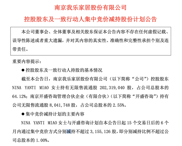 新浪定制频道讯 11月26日,南京我乐家居发出公告,称其5%以上第一大股东董事NINA YANTI MIAO女士,及公司实际控制人之一南京开盛咨询,作为公司一致行动人将减持不超过约300万股份,即约占公司总股本的1%股份。NINA YANTI MIAO女士此前持有约2亿股份,占公司总股本64.12%股份;开盛咨询则持有约804万股份,约占公司总股本的2.55%。本次减持计划均通过集中竞价方式,自公告日起15个交易日后的6个月内进行。