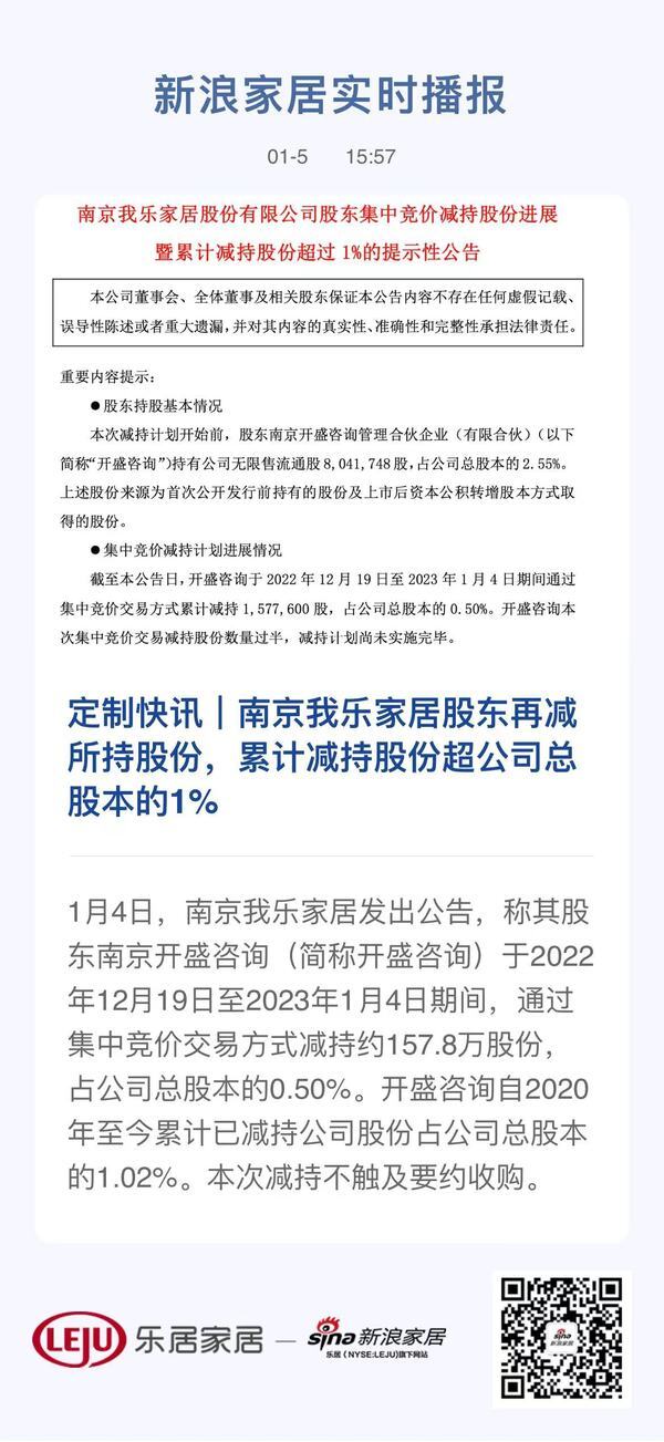 1月4日,南京我乐家居发出公告,称其股东南京开盛咨询(简称开盛咨询)于2022年12月19日至2023年1月4日期间,通过集中竞价交易方式减持约157.8万股份,占公司总股本的0.50%。开盛咨询自2020年至今累计已减持公司股份占公司总股本的1.02%。开盛咨询减持计划不触及要约收购。