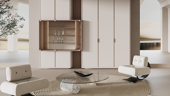 “铂菲”则通过智能工艺应用,采用隐藏式智能升降吊柜,提高吊柜使用空间率,并提高厨柜颜值。
