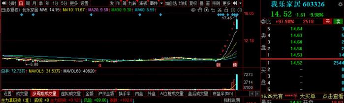 8月28日-9月6日,近一年多走势都较为平稳的我乐家居,股价突然连续拉出了8个涨停,涨幅高达114%,市值亦是水涨船高地从24亿元翻到了51亿元。
