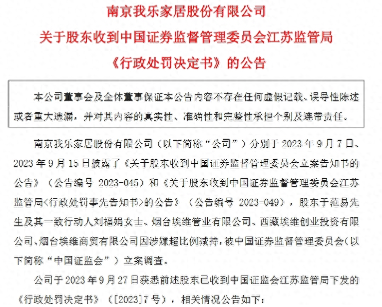 27日,我乐家居公告,收到中国证监会江苏监管局下发的《行政处罚决定书》。