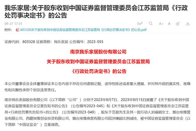 因股东违规减持,9月27日,我乐家居收到江苏证监局下达的《行政处罚事决定书》,对于范易、烟台埃维商贸有限公司、西藏埃维创业投资有限公司、烟台埃维管业有限公司责令改正,给予警告,没收违法所得1653万元,并处罚款3295万元。